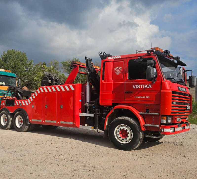 SCANIA – Sunkiasvorių transporto priemonių evakuatorius su pažangiomis hidraulinėmis šakėmis ir galinga gerve, skirtas saugiam ir efektyviam didelių bei sunkių transporto priemonių pervežimui iš avarinių ar gedimo situacijų.